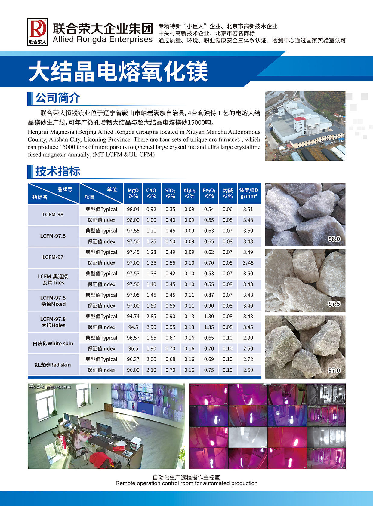 Hengrui Magnesia (Beijing Allied Rongda Group)is located in Xiuyan Manchu Autonomous County, Anshan City, Liaoning Province. There are four sets of unique arc furnaces , which can produce 15000 tons of microporous toughened large crystalline and ultra large crystalline fused magnesia annually. (MT-LCFM &UL-CFM)